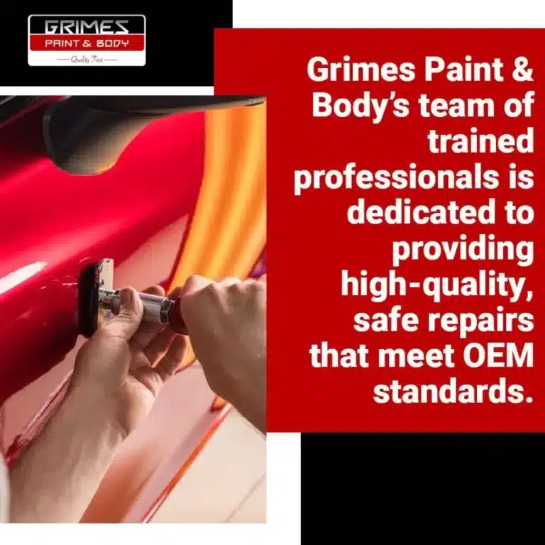 At Grimes Paint & Body, our technicians are highly trained and skilled in paintless dent repair (PDR). They follow OEM standards to guarantee that your vehicle is repaired with the highest level of precision and care. Whether it’s a small dent or larger damage, our team can handle it with expertise in paintless auto dent repair techniques. With years of experience, our technicians use advanced tools and methods to restore your vehicle while maintaining its structural integrity and appearance.