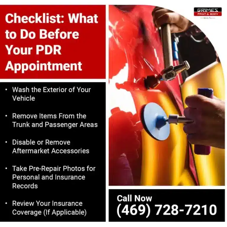Getting your vehicle ready before your paintless dent repair appointment can help the process go smoothly and improve the quality of the final result. By preparing properly, you support the technician in performing precise and efficient work. Here’s what you should do before your paintless dent repair service at Grimes Paint & Body in Forney, TX.
